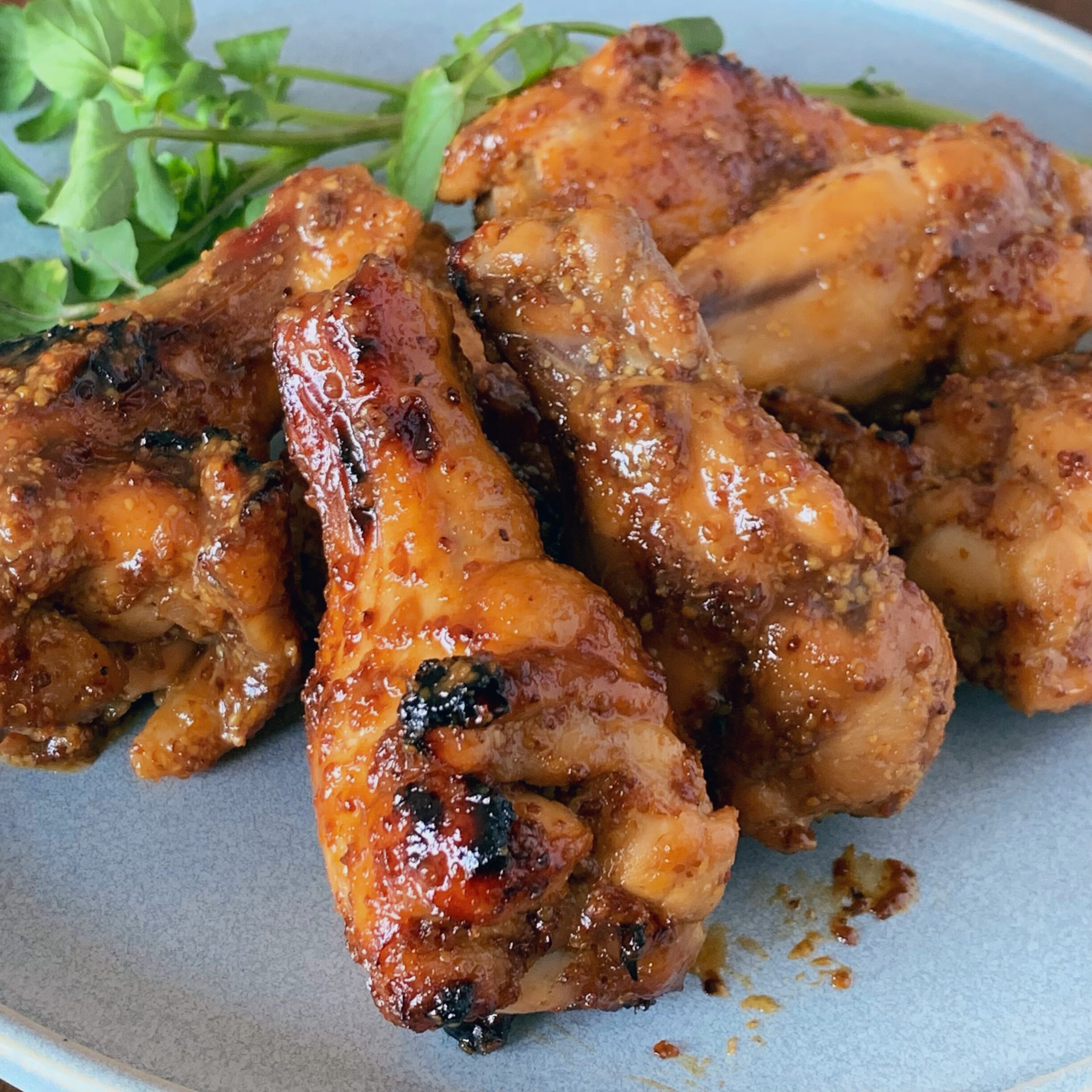 ジューシーな手羽中を、鮮やかなハニーマスタードソースに漬け込んで風味豊かに焼き上げました。オーブンで香ばしく仕上げた後、フライパンに残りのソースと一緒に煮絡めることで、カリッと焼き上がった黄金色の皮に濃厚で旨味たっぷりのグレーズ(照り)がしっかりと纏います。