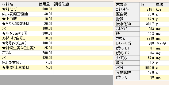 • エネルギー: 2,461 kcal(1人あたり約492 kcal)