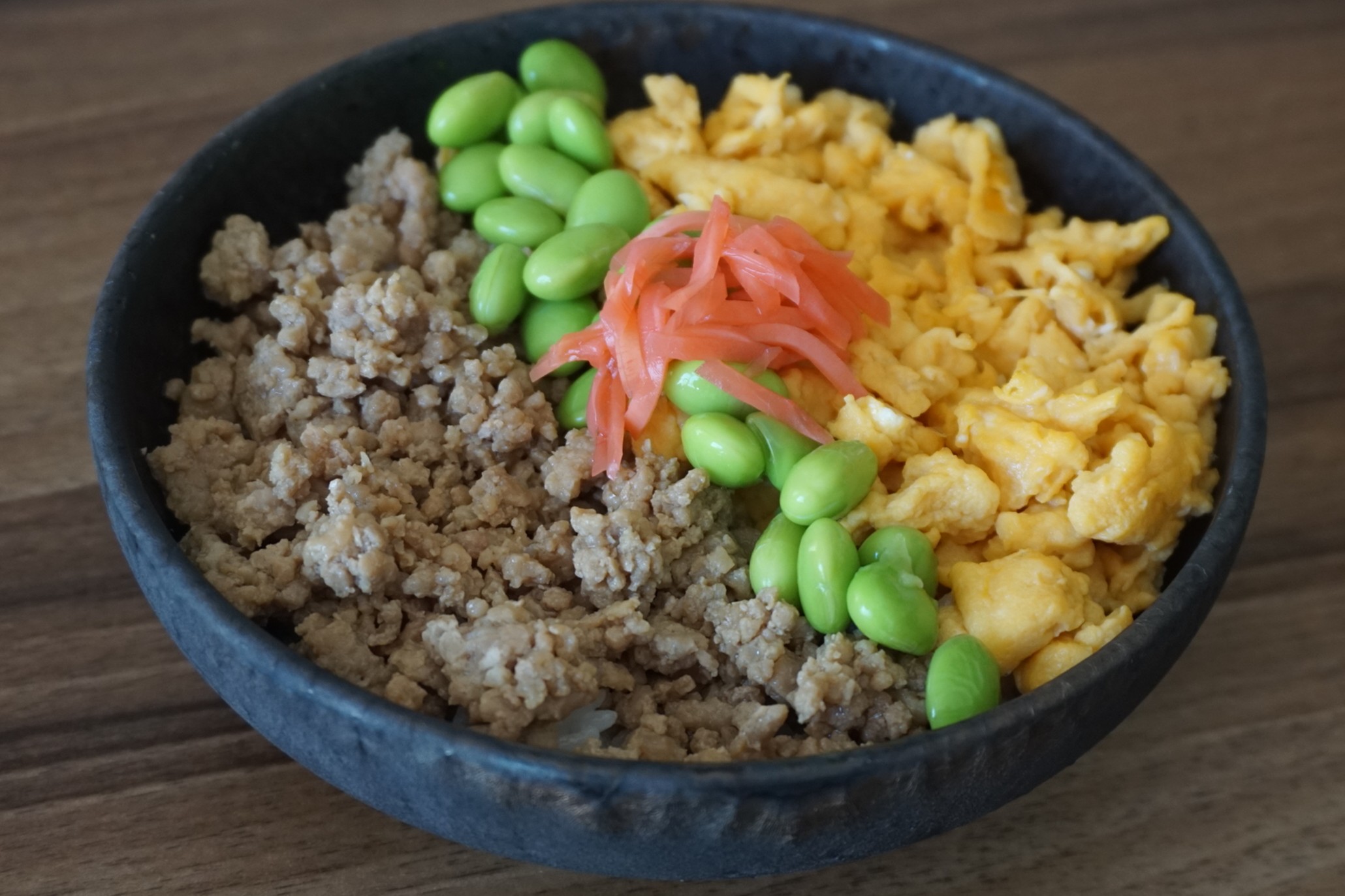 もっともポピュラーなのは、鶏ひき肉を醤油と砂糖で味付けしたものです。黄色い炒り卵や緑の野菜をのせることが多いため、「三色(さんしょく)丼」とも呼ばれています。