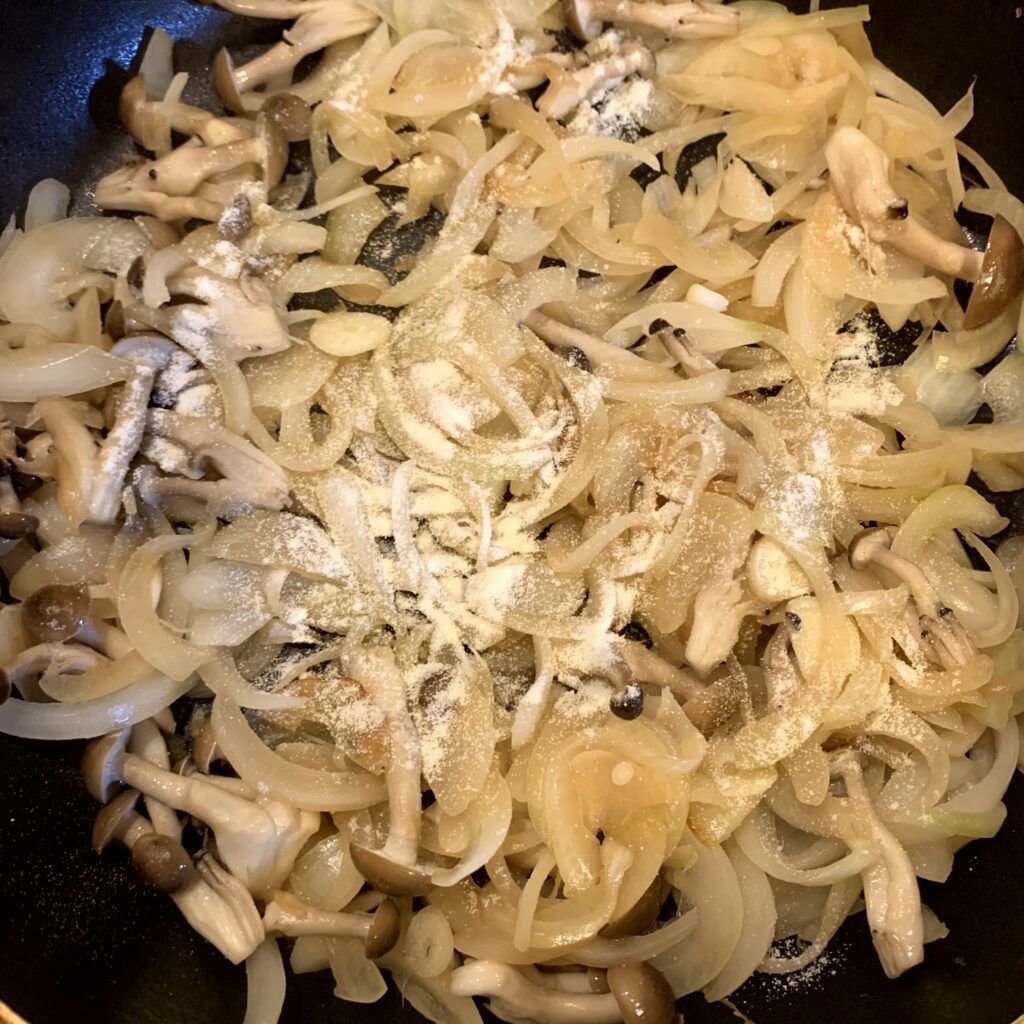 - Once the onions have softened, add the shimeji mushrooms and stir-fry briefly.