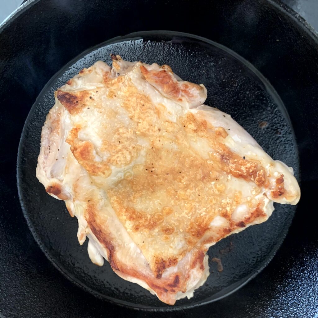 - Heat a skillet to very hot and then place the chicken skin-side down. It is better to heat the skillet until the steam rises before adding the chicken. It seems that the meat is less likely to burn that way. By doing so, I was able to actually bake it well. The skillet I used is from Nitori. I think the size is about 19 cm.