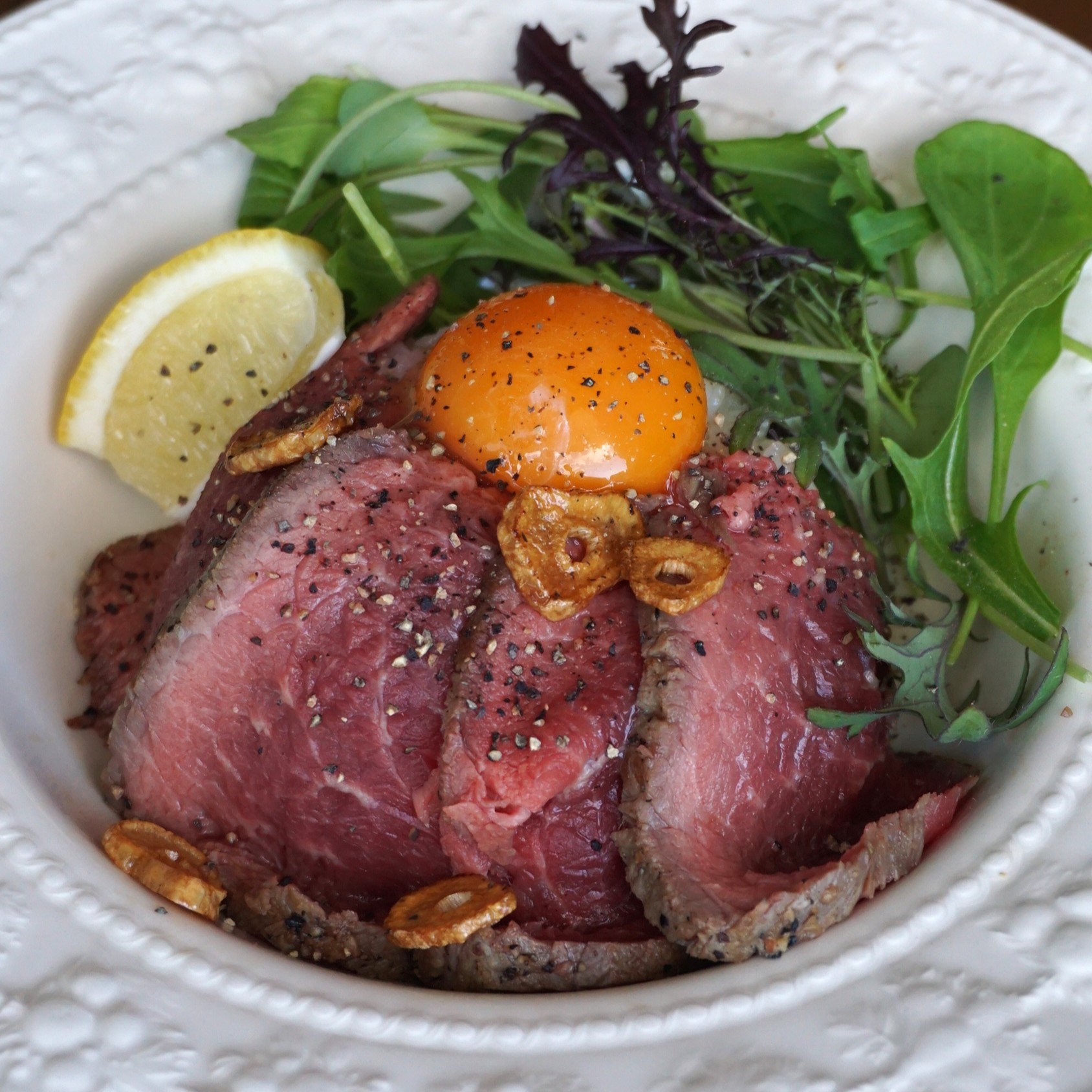 In this recipe, roast beef is served on white steamed rice and topped with a refreshing sauce and egg yolk. You can also add mustard or wasabi to suit your taste.