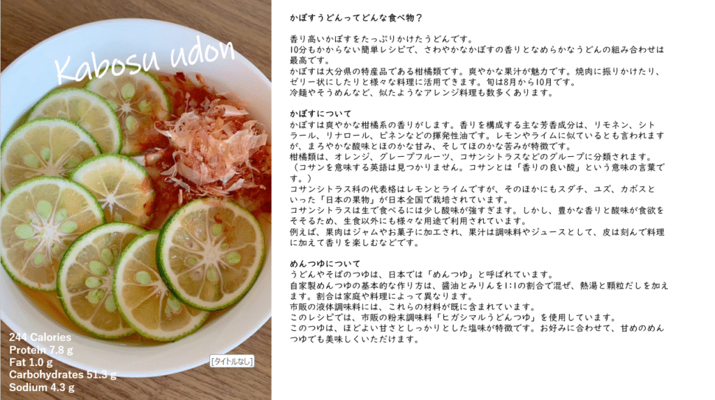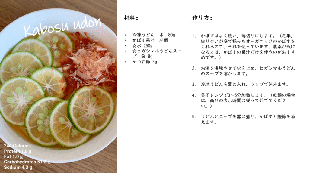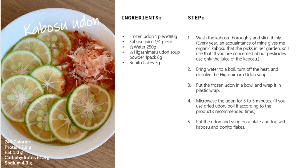 It’s a simple recipe that takes less than 10 minutes. The combination of the refreshing scent of kabosu and the smooth udon is the best.
