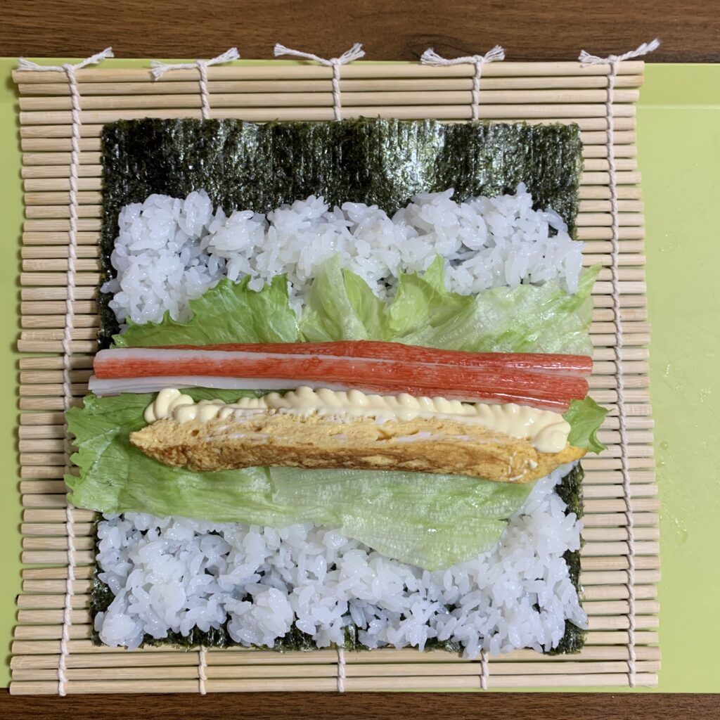 - Place lettuce, tamagoyaki, kanikama, and mayonnaise on top of the rice.