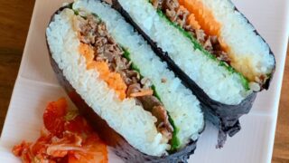 staple food Beef yakiniku onigirazu (Rice Balls) Onigirazu is a new type of rice ball. This recipe consists of rice, yakiniku beef, and vegetables served on a large sheet of nori seaweed. 2023.02.17 staple food