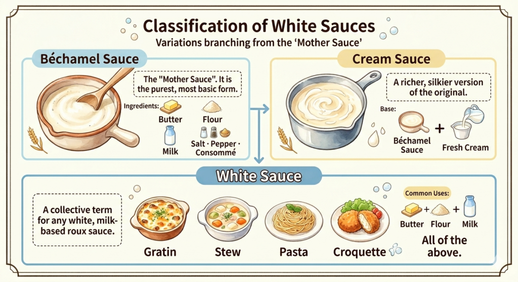 | Béchamel | Butter + Flour + Milk + Salt/Pepper/Consommé | The “Mother Sauce.” It is the purest, most basic form. |