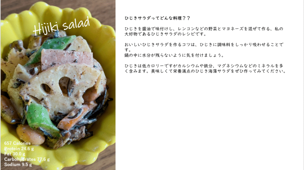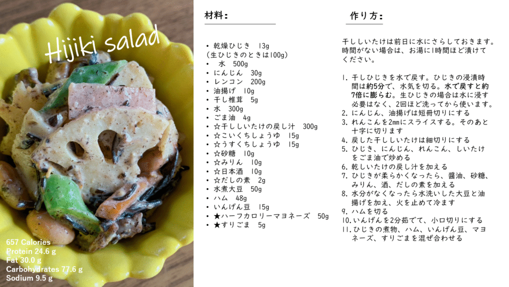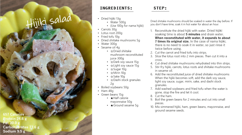 This is a recipe for Hijiki seaweed salad, which is made by seasoning hijiki with soy sauce, mixing it with lotus root and other vegetables and mayonnaise. This is my favorite dish.