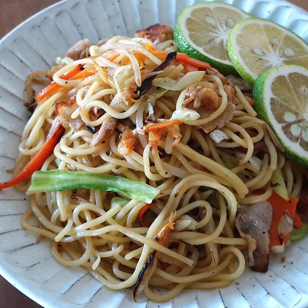 The key to my shio yakisoba recipe is to squeeze in plenty of kabosu (citrus fruit). If kabosu is unavailable, I use lemon.